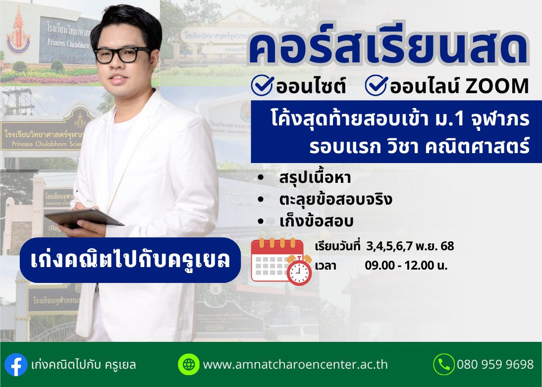 คอร์สเรียนสดออนไซต์และสดออนไลน์ วิชา คณิตศาสตร์ สำหรับเตรียมสอบเข้า ม.1 รร.วิทยาศาสตร์จุฬาภรณราชวิทยาลัย ในช่วงโค้งสุดท้ายเพื่อเตรียมความพร้อมก่อนสอบเข้ารอบแรก เพื่อคัดนักเรียนเข้าเรียนประจำปีการศึกษา 2569 โดยทั้งครูเยลจะพานักเรียนทบทวนและสรุปเนื้อหาที่ต้องใช้ในการสอบทั้งหมด ตะลุยข้อสอบเก่าและเก็งข้อสอบที่คาดว่าจะออกสอบในปีนี้