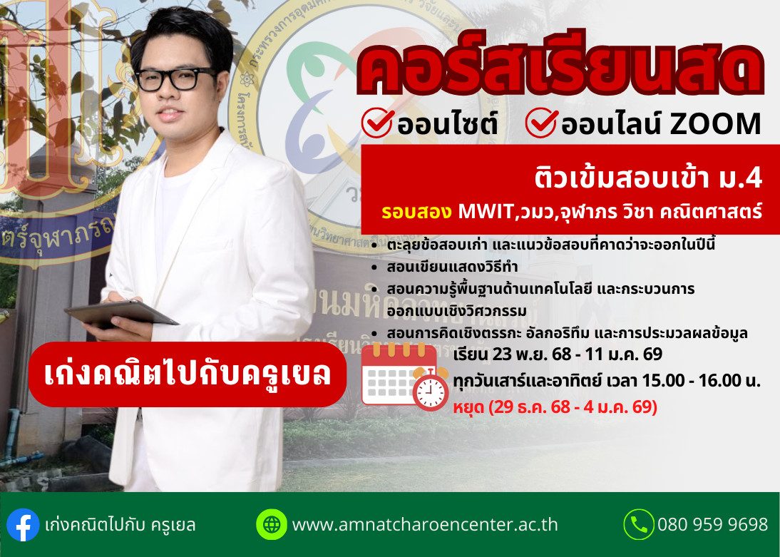 วิชาคณิตศาสตร์ + เทคโนโลยี – ติวเข้มสอบเข้า ม.4 รร.มหิดลวิทยาณุสรณ์ , ทุน วมว. และรร.วิทยาศาสตร์จุฬาภรณราชวิทยาลัย เพื่อเตรียมสอบรอบสอง ประจำปีการศึกษา 2569