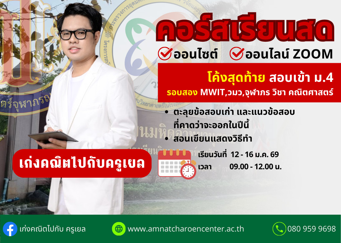 วิชาคณิตศาสตร์ – ติวเข้มสอบเข้า ม.4 รร.มหิดลวิทยาณุสรณ์ , ทุน วมว. และรร.วิทยาศาสตร์จุฬาภรณราชวิทยาลัย เพื่อเตรียมสอบรอบสอง ในช่วงโค้งสุดท้าย 5 วัน ก่อนสอบ ประจำปีการศึกษา 2569