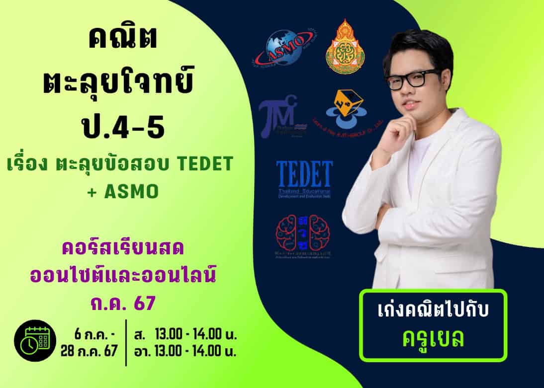 คอร์สเรียนสดออนไซต์และสดออนไลน์ วิชา คณิตตะลุยโจทย์ ป.4-5 ที่เหมาะสำหรับนักเรียนทุกคนที่อยากเตรียมตัวเตรียมตัวสอบแข่งขันในสนามสอบ สพฐ.(นานาชาติ) , TEDET , ASMO , TMC , ราชภัฏพระนคร(LMPC) , สวช , Math contest ตามโรงเรียนที่มีชื่อเสียงทั่วประเทศ และนอกจากนี้ยังสามารถนำความรู้ที่ได้จากคอร์สนี้ไปใช้ในการเตรียมตัวสอบเข้าม.1 โรงเรียนวิทยาศาสตร์จุฬาภรณราชวิทยาลัย , ห้องเรียนพิเศษวิทยาศาสตร์และคณิตศาสตร์โรงเรียนดังทั่วประเทศ