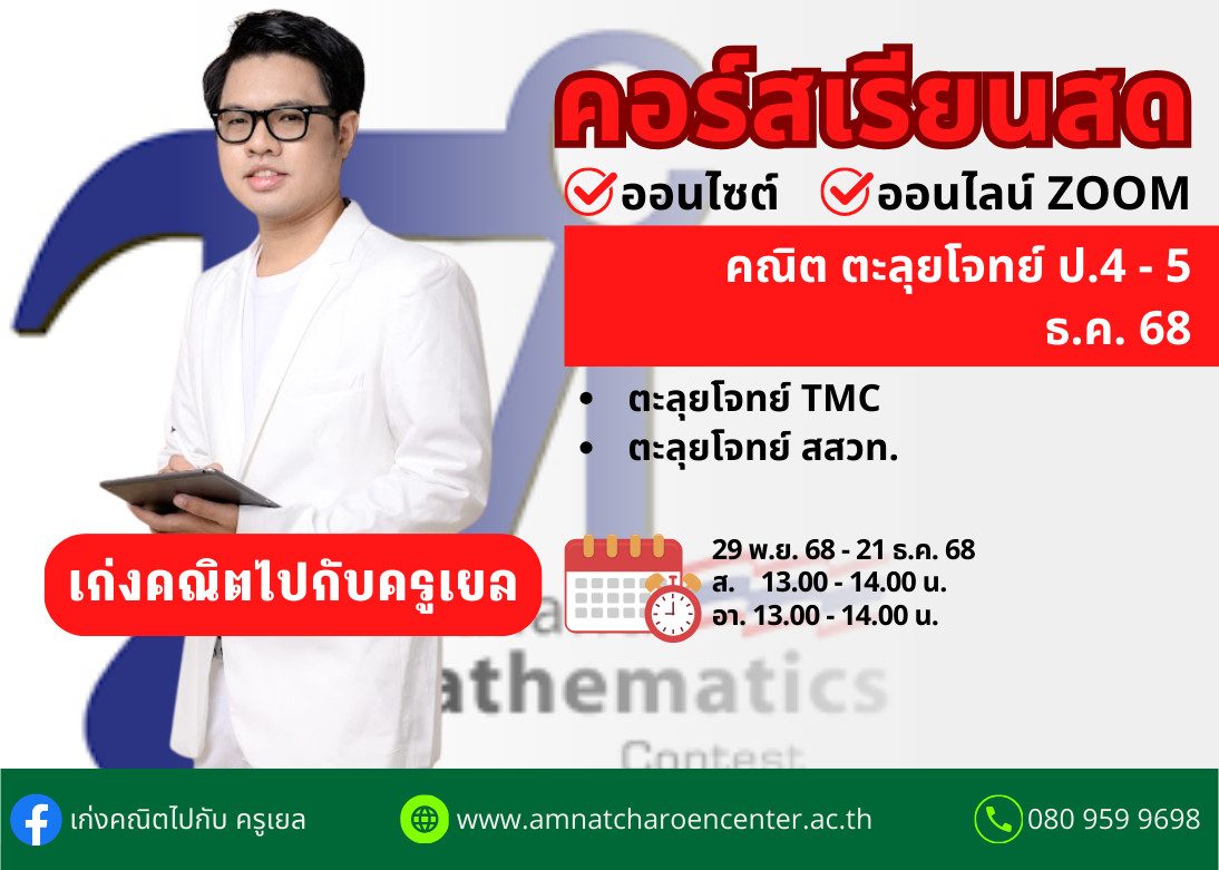 คอร์สเรียนสดออนไซต์และสดออนไลน์ วิชา คณิตตะลุยโจทย์ ป.4-5 ที่เหมาะสำหรับนักเรียนทุกคนที่อยากเตรียมตัวเตรียมตัวสอบแข่งขันในสนามสอบ สพฐ.(นานาชาติ) , TEDET , ASMO , ASMOPSS , TMC , ราชภัฏพระนคร(LPMC) , สวช , IMGO และ Math contest ตามโรงเรียนที่มีชื่อเสียงทั่วประเทศ และนอกจากนี้ยังสามารถนำความรู้ที่ได้จากคอร์สนี้ไปใช้ในการเตรียมตัวสอบเข้าม.1 โรงเรียนวิทยาศาสตร์จุฬาภรณราชวิทยาลัย , ห้องเรียนพิเศษวิทยาศาสตร์และคณิตศาสตร์โรงเรียนดังทั่วประเทศ